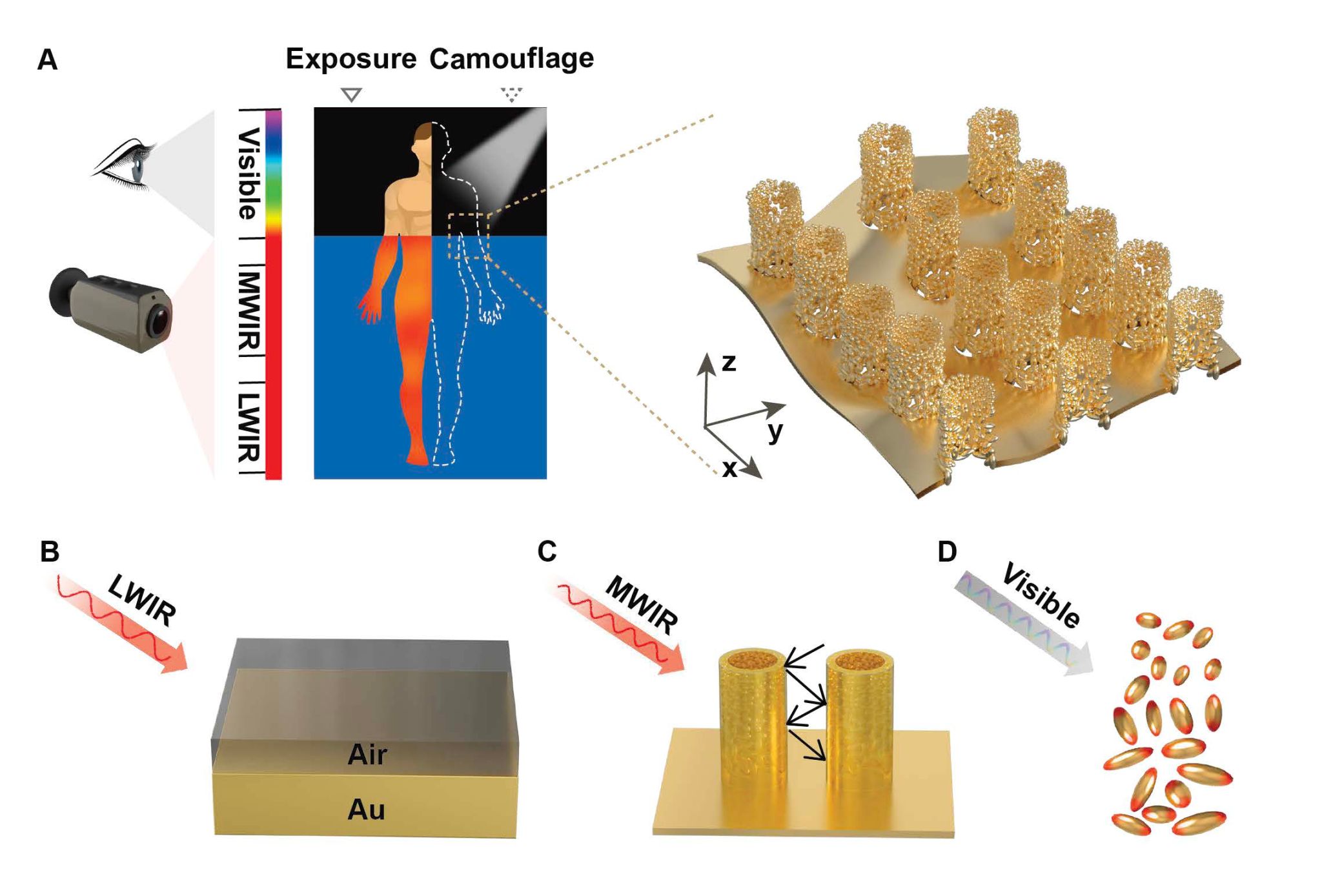 Fig. 1. Schematic and mechanism of the NPAHP-based skin-like metamaterial for dual-band camouflage. (A) Schematic of the NPAHP-based skin-like metamaterial attached to the human body surface (Exposure: uncovered part; Camouflage: covered with NPAHP-based skin-like metamaterial) for the visible and infrared dual-band camouflage. (B) For the LWIR band, nanoscale structures are negligible, the optical property is mainly dependent on the filling ratio of Au (f) by effective medium theory. (C) For the MWIR band, the multiple scattering effect of Au pillars (hundreds of nanometers in scale) dominates the optical property. (D) For the visible band, the LSPR effect of Au NPs (tens of nanometers in scale) plays the dominant role.