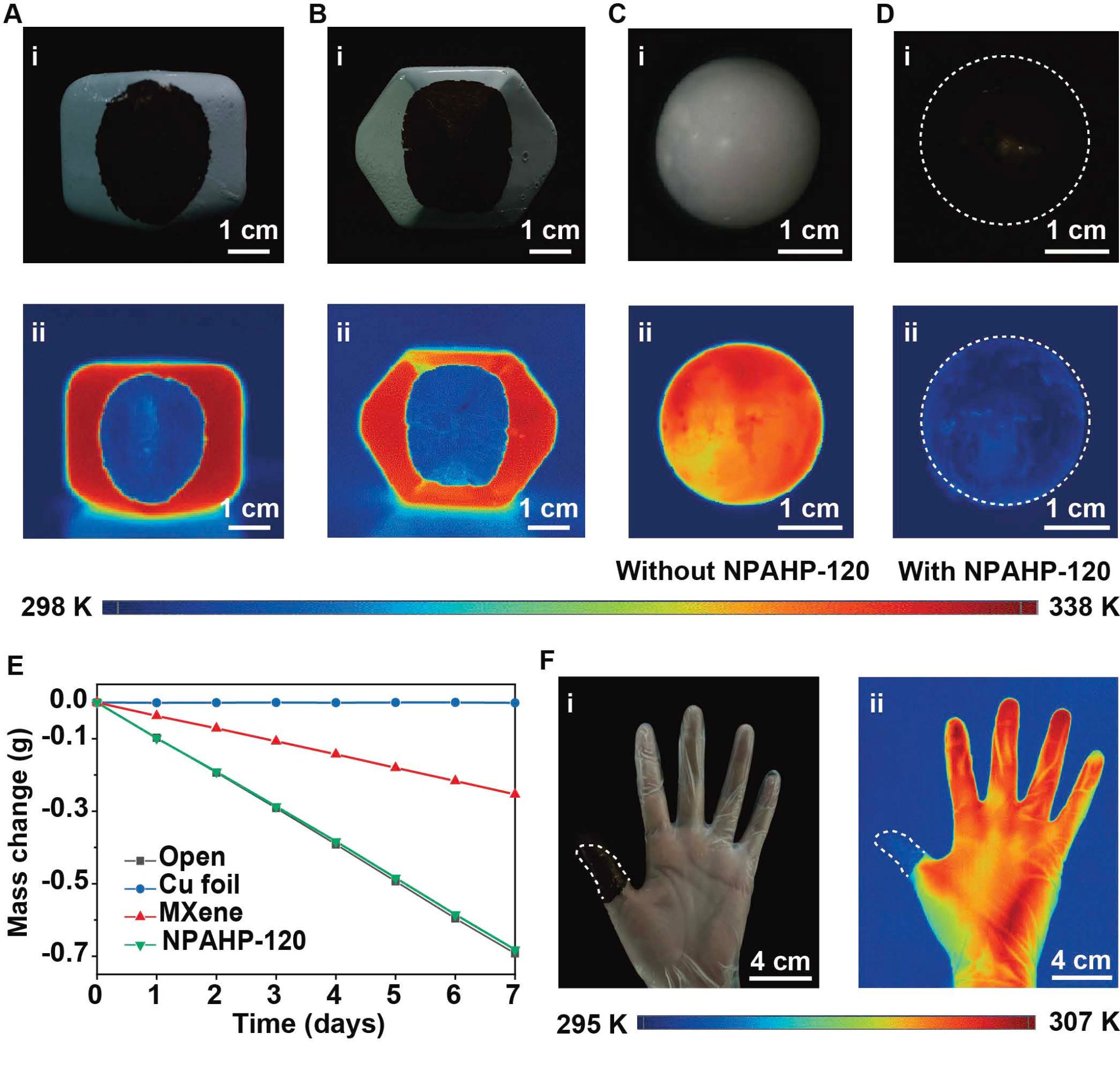 Fig. 4. NPAHP-120-based skin-like metamaterial for dual-band camouflage, demonstrating good attachability and wearable potential. (A and B) Optical and infrared photographs of the NPAHP-120-based film attached to painted stainless-steel polyhedra. (C and D) Optical and infrared photographs of a spherical object uncovered (C)/covered (D) with the NPAHP-120-based film. (E) Water vapor transmission tests of the open state, the NPAHP-120-based film, MXene, and Cu foil. (F) Optical and infrared photographs of the NPAHP-120-based film attached to a finger.