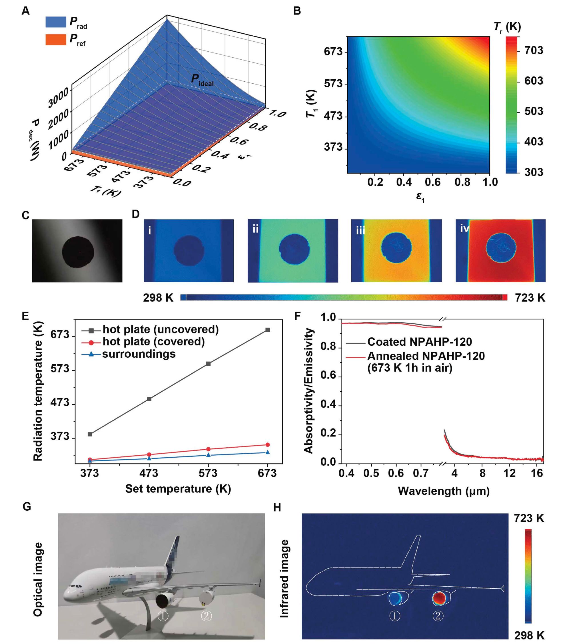 Fig. 5. Demonstration of high-temperature camouflage performance of the NPAHP-120-based skin-like metamaterial. (A and B) Dependence of Pdet (A), and Tr (B) on T1 and ε1. (C) Optical photograph of the NPAHP-120-based camouflage film. (D) Infrared photographs of the hot plate covered with NPAHP-120-based camouflage film at different set temperatures (373, 473, 573, 673 K). (E) Detected radiation temperature of the hot plate (covered and uncovered with NPAHP-120-based film), and surroundings at different temperatures. (F) The unchanged experimental absorption spectra of the NPAHP-120-based camouflage film after air annealing at 673 K for 1 h, which suggests its good stability at high temperature. (G and H) Optical (G) and infrared photograph (H) of the aircraft engine models covered () and uncovered () with NPAHP-120-based camouflage film.
