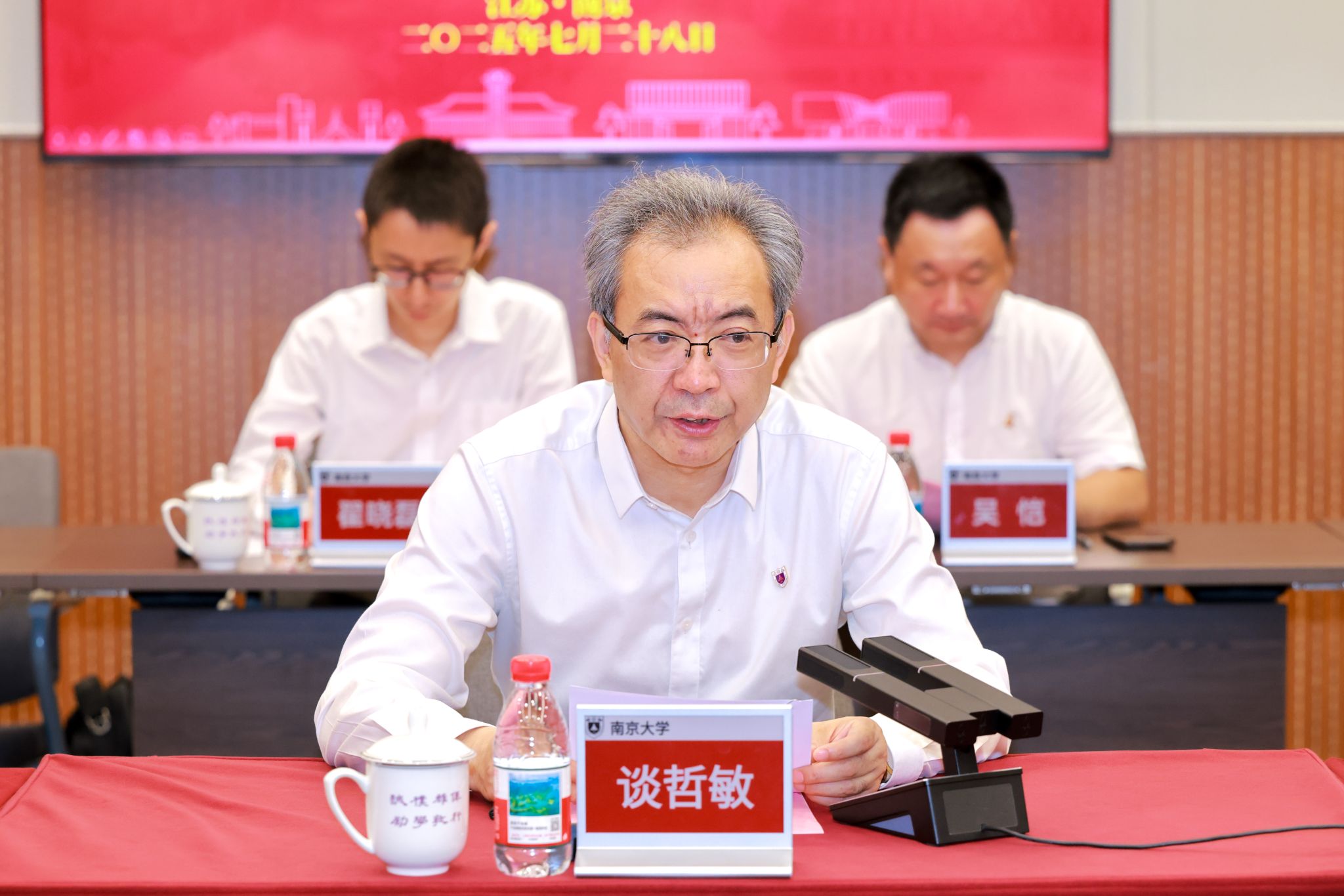 Tan Zhemin extended a warm welcome to Du Jiangfeng and his delegation, and expressed sincere gratitude to the Ministry of Education, the Jiangsu Provincial Department of Education, and brother universities for their long-term care and support for NJU's development. He pointed out that the "Double First-Class" initiative is a major strategy and an important means to build a strong nation in education. It is NJU's aspiration and mission to share the destiny with the nation and seek national prosperity and pursuing progress in science and education. He briefly introduced NJU's recent achievements in accelerating the "Double First-Class" construction. NJU has dedicatied itself to cultivating urgently needed high-level talents for the nation, actively benchmarking international standards, enhancing international influence, deepening reforms in top-notch innovative talent cultivation, and contributing NJU's strength to serving national strategic needs.