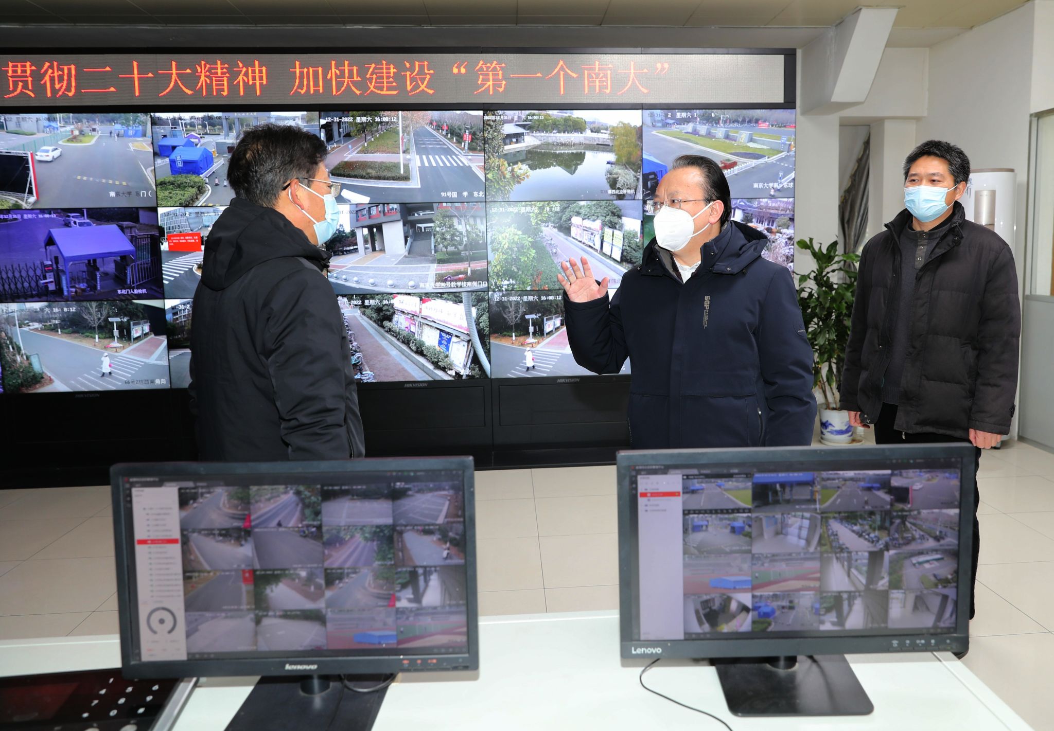 At the 110 Alarm Center of the campus security office, Tan learned of the daily routine of the staff and inspected the campus scenes through real-time CCTV monitoring. Tan inquired about the health of the staff on duty, expressed sincere thanks for their hard work, and pointed out that “Nanjing University is worth protecting by us all”. In such a special time, he hoped that everyone will continue to effectively safeguard the campus.