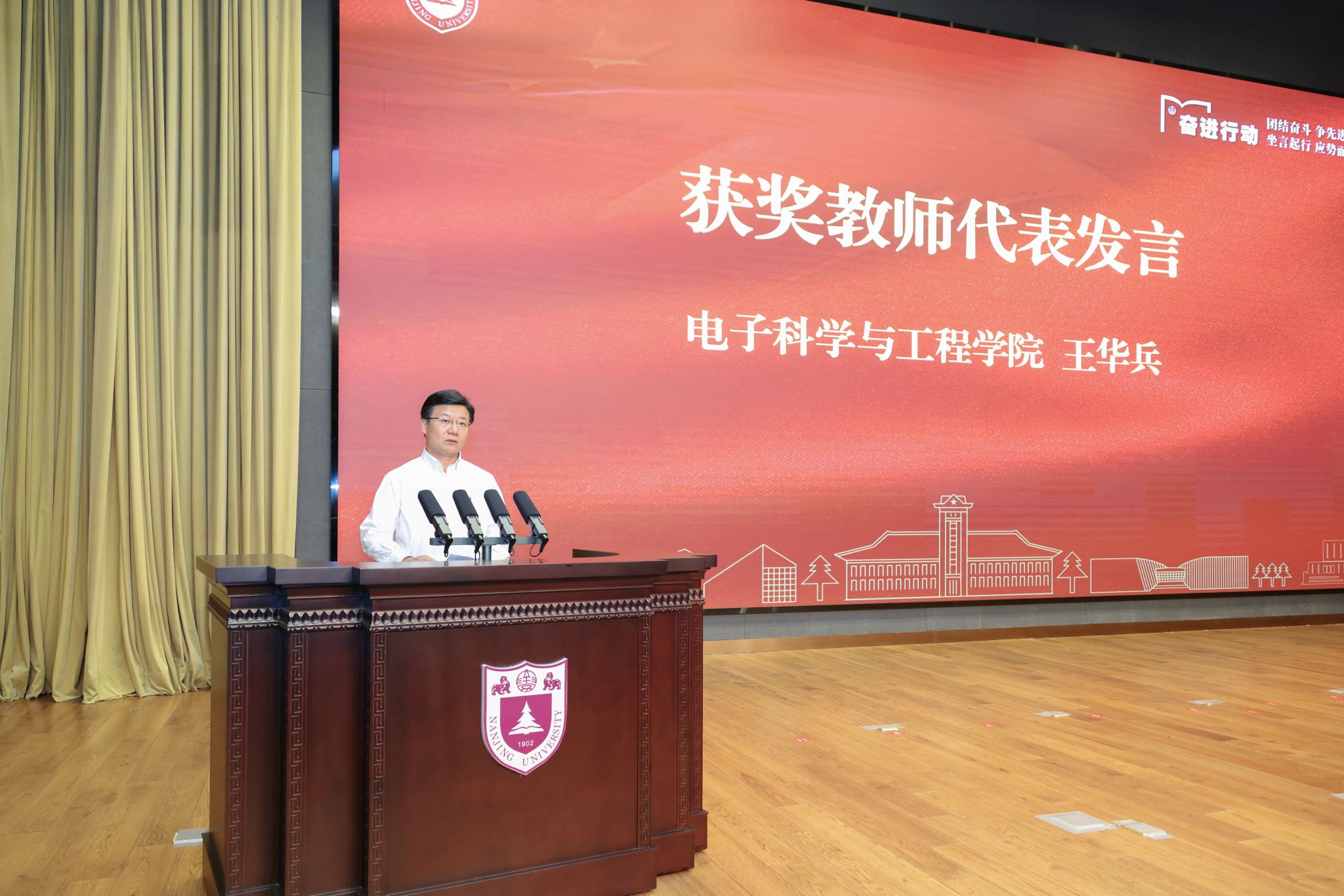 “师德先进”个人获奖者、电子科学与工程学院教授王华兵分享了自己与团队坚持立德树人育英才的经历与感悟。他说,教师输出的不只是知识,还有信心与力量,愿每一位老师以教育家精神自勉,用行动擦亮“凯发老师”这张名片。