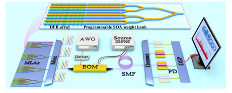 此外,深度神经网络的实现通常依赖于一定的加权精度,如张量处理单元(TPU)通常具有8bit或更高的精度。目前,较低的精度也被认为是限制光学计算发展的一个瓶颈。不同于常见的基于相变材料(PCM)、马赫-曾德尔干涉仪(MZI)、微环谐振器(MRR)的光子权重库。研究团队提出了一种光源-权重库一体式集成的DFB-SOA阵列权重库。使用单片集成的多波长激光器阵列(MLA)被用作波长复用源,并且每个信道都配备有用于逐行幅度控制的专用SOA。不同于MRR权重库的高度工艺/温度敏感性,SOA权重库仅需要简单的温度控制,就能作为光子突触提供9.2 bit的精度,满足了张量计算需求。