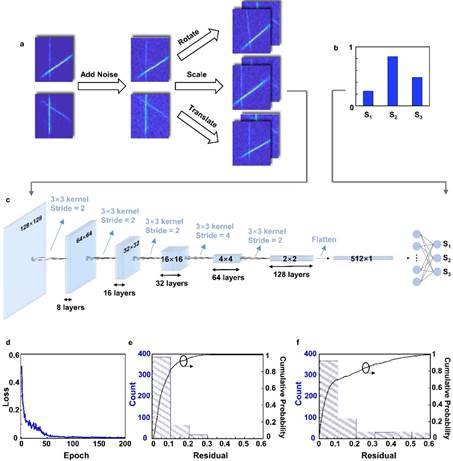 2. 用于偏振分析的神经网络架构。(a)数据增强后的输入图片。 (b) 输出为对应的斯托克斯参量。 (c) 卷积神经网络的结构参数。(d) 基于训练周期的损失函数。针对(e) 20微米和 (f) 10微米空间分辨率的测试数据的统计分布和累积概率分布。