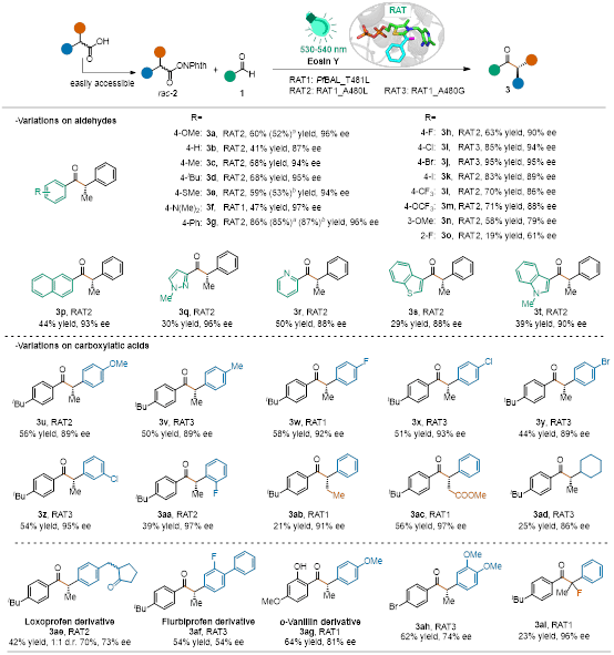团队以4-甲氧基苯甲醛1a和自由基前体氧化还原活性酯2a作为模板底物,探索了有机染料曙红Y和ThDP依赖酶的催化体系。随后通过分子动力学模拟和半理性设计构建了小而精的突变体库,能够快速、低成本地获取最优突变体酶。该体系有非常好的底物耐受性,能够接受的底物包括各种邻、间、对位取代的芳香醛、杂环芳香醛和各种取代基的羧酸衍生物。文章展示了35个例子,对映选择性最高达97% ee,凸显了酶可调的活性口袋对于游离自由基立体化学的精妙调控作用。