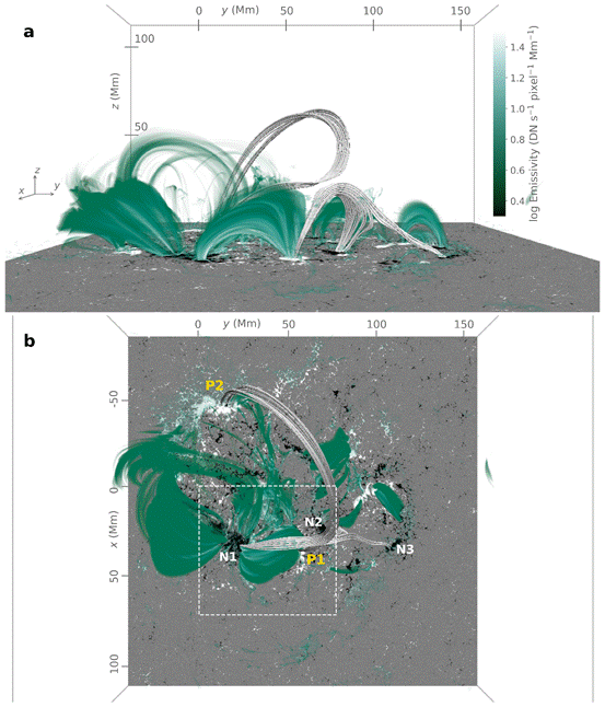 图1:太阳活动区磁场及AIA 94 埃辐射的三维建模,清晰展示了活动区复杂的多极磁场与丰富的高温冕环。
