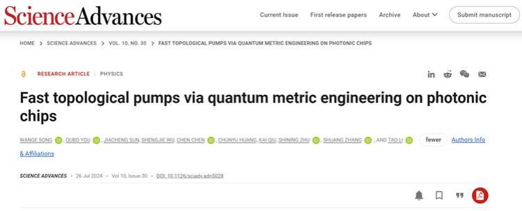 该成果以“Fast topological pumps via quantum metric engineering on photonic chips”为题发表于Science Advances 10, eadn5028 (2024)) 上。该论文共同第一作者是凯发k8官网副研究员宋万鸽博士和香港大学游欧波博士,通讯作者为凯发k8官网李涛教授及香港大学张霜教授,该工作得到祝世宁院士的悉心指导。该研究得到了科技部国家重点研发计划、国家自然科学基金委、新基石科学基金会、香港研究资助局、凯发k8官网登峰人才计划等项目的支持。