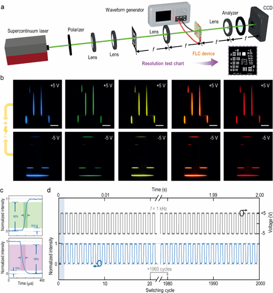 可控的矢量光场偏振分布旋转为光学图像边缘的选择性识别提供了新思路。研究团队利用4f系统(图3a),经偏振片调制后的光学图像“1”照射置于4f系统频谱面的铁电液晶超结构,在外电场极性为正时,检偏片清晰地滤出了该图像的竖直边缘像;反转外加电场的极性,输出像切换为水平边缘(图3b)。动态控制电场的极性,实现了光学图像边缘的快速选择与动态切换。值得注意的是,得益于正交检偏的光路设计,未调制的零级光被强烈抑制,使得该方案在可见至近红外的宽光谱范围内均可适用。