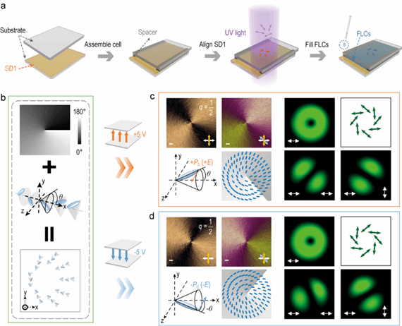 研究团队利用非对称平面锚定、光控图案化取向和缓变降温技术(图2a)在铁电液晶中引入螺旋渐变排列及中心拓扑奇点,构筑了拓扑手性层状超结构,如图2b所示,实现了沿角向渐变的面内等效光轴分布。得益于铁电液晶的独特电场刺激响应性,在施加大于或等于阈值电压的外电场时,该液晶螺旋超结构将发生解旋和重构,对矢量光场有不同的调制作用。外加电场极性为正时,等效光轴实现+θ的同步旋转;极性为负时,等效光轴实现-θ的同步旋转。改变外加电场极性,出射线偏振方向发生整体同步旋转,形成具有另一种偏振分布的矢量光束,从而实现了矢量光束的旋转变换。