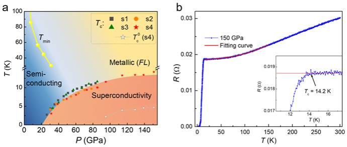 图2. (a) MnB4在压力下的超导相图。(b) 在测试的最高压力(150 GPa)下,超导起始转变温度为14.2 K,同时正常态表现出符合费米液体的金属性行为。