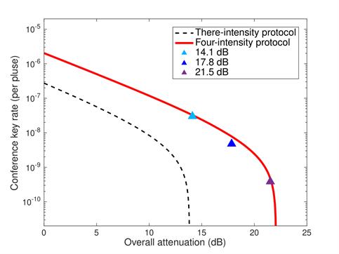 为了实现测量设备无关量子会议密钥分发协议,研究团队一方面在理论上将原始的三强度诱骗态协议改进为了四强度诱骗态协议。在发送脉冲数有限且符合计数率较低的情况下,新的四强度诱骗态协议的安全密钥率相较原协议有明显提升,同时通信距离也有显著增加。另一方面,研究团队在理论上研究并在实验上实现了弱相干光脉冲GHZ态投影测量中的多光子干涉现象。研究团队搭建了三用户通信网络,并最终分别在系统整体损耗约为14.1dB,17.8dB和21.5dB的情况下获得了约7.54bps,1.17bps和0.097bps的会议密钥率。近期,南方科技大学团队完成了相关工作(Phys. Rev. Lett. 133, 210803),与本工作一起推进实用化、多用户量子网络的发展。