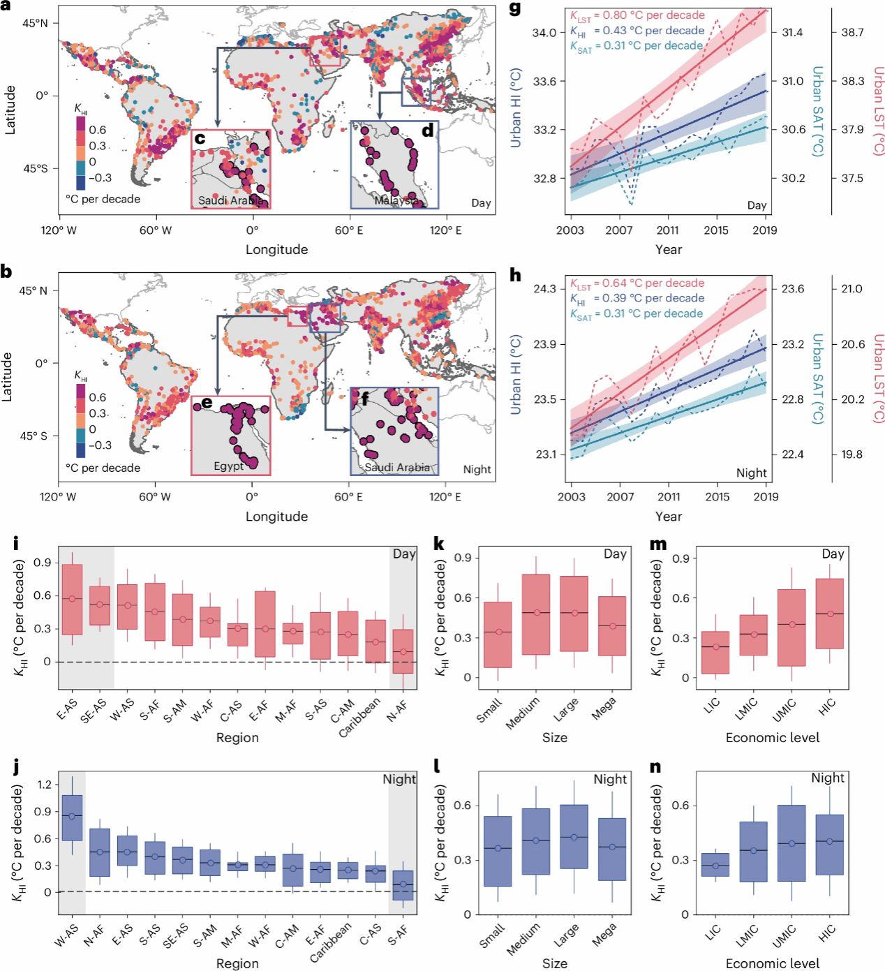 图1.全球南方城市湿热变化趋势空间分布格局,及其与基于地表温度和空气温度量化的城市变暖趋势的对比(Duetal.,2025)