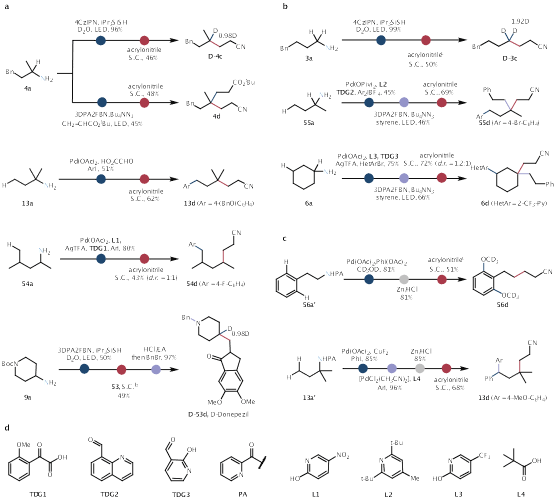 Fig. 3 | Multiple functionalization using N-atom as a traceless directing group. a, Difunctionalization strategies shown include 1,1-dialkylation, 1,1-deturoalkylation, 1,3-alkylarylation, 1,4-alkylarylation, and the synthesis of D-Donepezil. b, Trifunctionalization reactions include 1,1,1-dideturoalkylation and 1,1,3-dialkylarylation. c, 1,4,4-Alkyldialkoxylation and 1,3,3-alkyldiarylation of protected amines. d, Structures of transient directing groups (TDGs), picolinamide (PA) and ligands (L).