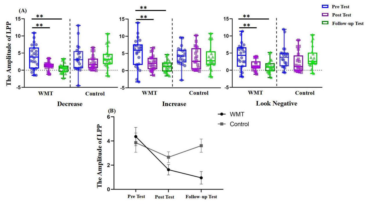(B)实验组和控制组从前测到追踪LPP幅值的变化.