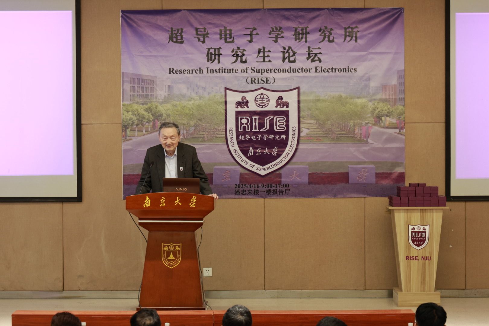 吴培亨院士在致辞中着重强调了“论”字的意义,鼓励大家充分利用此次机会集思广益、深入讨论。吴培亨院士详细解释了超导电子学研究所的英文简称“RISE”与所徽的来历与含义,期待超导电子学研究所在师生的共同努力下成为超导电子学界的“黄埔军校”。他勉励各位师生,要在党的领导下,发扬黄埔军校在民族大义和专业建树上的黄埔精神,争取取得更大的成绩。
